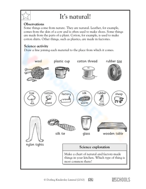In this science worksheet, your child will learn about common materials and items that come from nature (such as wool, rubber tires, and silk ties) or synthesized products that come from a factory (such as nylons and plastic) and connect each item to its natural or manufacturing origin.