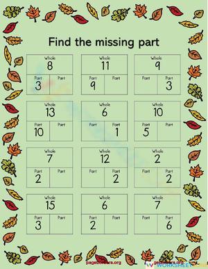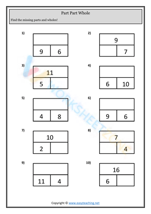 This worksheet typically present equations or diagrams where a whole quantity is divided into two parts. Students are tasked with finding the missing part or whole. This approach fosters foundational skills in addition, subtraction, and understanding how numbers relate within a given context.