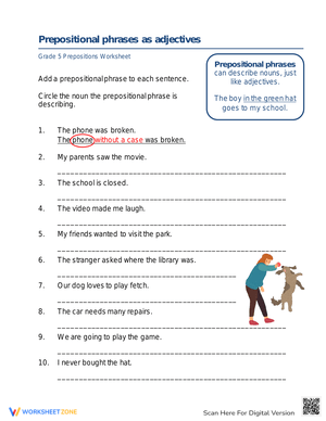 A prepositional phrases worksheet for Grades 6-9. Students identify prepositional phrases and determine whether each one functions as an adjective or adverb. Great for grammar analysis and sentence structure practice.
