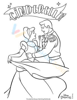 Cinderella and her prince are dancing happily in a ball! Let's paint this with more colors than just black and white!