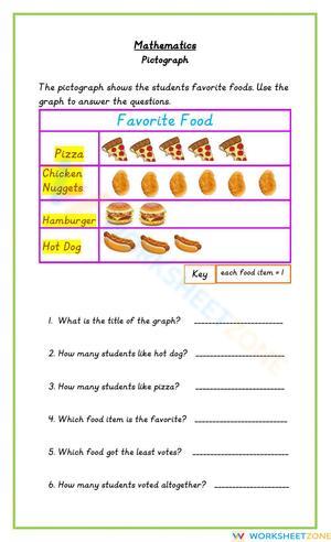 Favorite food pictograph worksheet for Grade 2–3 students to practice reading graphs, counting data, and answering questions based on a pictograph.