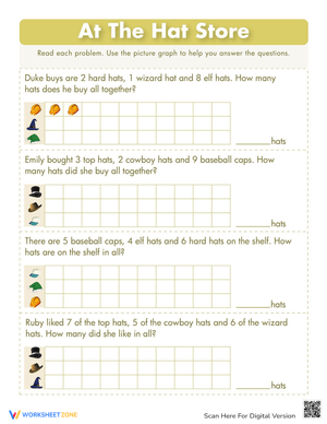 Practice adding multiple digits with a fun pictograph page. Use the chart to draw out the number of items in each problem. Then count them up to help you add three digits together.