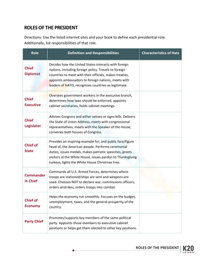 Outline eight roles of the President with this detailed worksheet! Explore the responsibilities of the U.S. head of state. Perfect for civics classes now!
