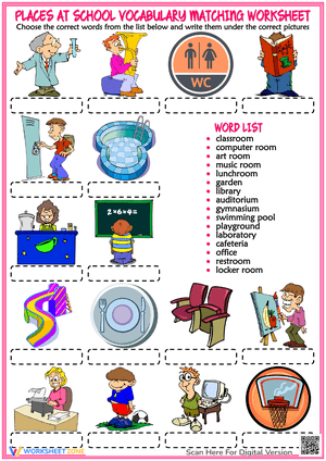Boost vocabulary with this matching school places worksheet! Engage young learners and build essential language skills in a fun way. Learn school vocabulary now!