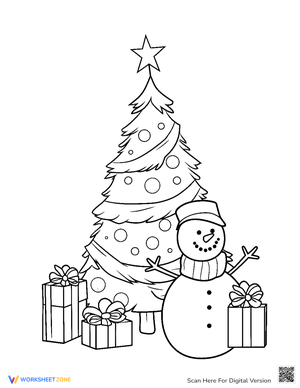 Delight in the winter magic as a snowman joins in the festivities around a charming Christmas tree.