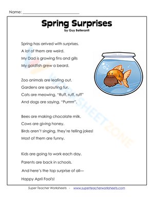 The biggest surprise of all is an April Fool's Day joke! Poem includes reading comprehension questions, vocabulary words, and a writing prompt.