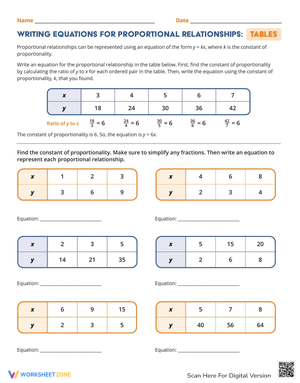 Write equations for proportional relationships using tables with this helpful worksheet! Enhances algebraic thinking. Download now! #Equations