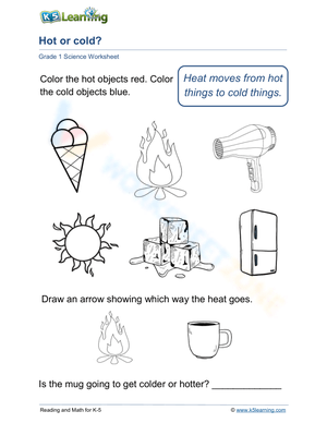 Heat transfers from hot things to cold things. In this worksheet, students identify hot and cold objects and the direction that heat moves.