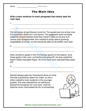 Someday we will all have robots that will be our personal servants. They will look and behave much like real humans. We will be able to talk to these mechanical helpers and they will be able to respond in kind! Amazingly, the robots of the future will be able to learn from experience. They will be smart, strong, and untiring workers whose only goal will be to make our lives easier.What is this selection mainly about? : Someday we will have robots that will be our personal servants.. Many people have not heard giraffes make noises. Giraffes do not use sounds to “talk” with each other. When hurt, giraffes make a low moo, something like a cow. When frightened, they make a short, high sound.What is the main idea: Giraffes do make noises . Floods can cause tremendous damage. They can ruin houses, roads and buildings. Floods can take down trees and cause mudslides. It often leaves mud, sand and debris behind. It can take months to clean up after a flood. What is the main idea: Floods can cause a lot of damage.. Steel is a very important metal which is used for many things. In the United States, the automobile industry uses the most steel. Steel is used in putting up buildings. Cans and containers are made from steel. Steel is used to make farm and factory machines.The Main Idea Is:: Steel is used for many purposes.. There are about 2,000 kinds of bats. They come in many sizes. Bats are rather strange looking animals. They are soft and furry with large ears. Bats cannot walk or run. They usually eat insects. Bats are the only mammals that fly.The Main Idea Is:: Bats are unusual animals.. In 1903, Wilbur and Orville Wright were the first people to successfully fly an airplane. As children, the brothers enjoyed building and tinkering with things. Later, they owned printing and bicycle making businesses. The skills and money made from these businesses helped them create several aircrafts during the 1890’s. Finally, in 1903, the Wright brothers successfully flew the first controlled airplane at Kitty Hawk, North Carolina: The Wright brothers were the first to fly.. Main idea: Natural disaster preparednessWhich detail supports the main idea? : Scientists look at weather trends to know which areas would be likely to have a natural disaster . Which term best describes the main idea of a piece of writing: A central point. Niagra Falls is one of the most beautiful sights in North America. It is on the Niagra River halfway between Lake Ontario and Lake Erie. Niagra Falls is located on the American and Canadian border. The American Falls is 167 feet high. On the Canadian side, the Horseshoe Falls is 161 feet high. Which of the following is NOT a supporting detail? : Niagra Falls is one of the most beautiful sights in North America