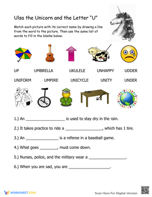 Enhance your child's understanding of the letter 'U' with this playful worksheet featuring Ulsa the Unicorn. Complete the sentences based on the corresponding images.