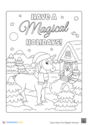 Add some magic to your holidays with this enchanting Christmas tree coloring page! Features a unicorn, winter scene, and gingerbread house.