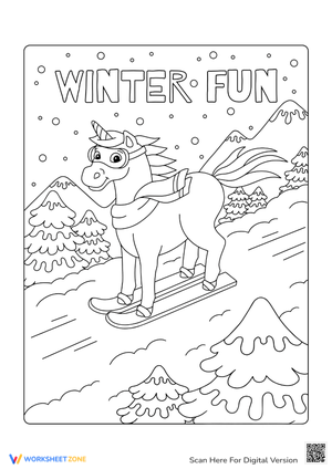 Embrace the enchantment of winter with this whimsical Unicorn Coloring Page. This printable features a unicorn skiing through a snowy landscape.