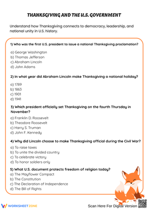 Explore Thanksgiving’s link to democracy with this U.S. Government Quiz for Grades 4–6! Learn how presidents like Lincoln and Roosevelt shaped the national holiday and its civic values.