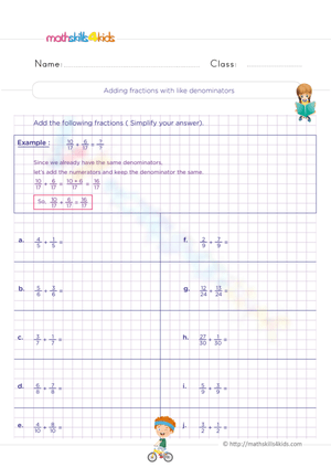 Practice adding fractions with like denominators with this clear, engaging worksheet. Includes a step-by-step example and 10 problems for grades 4 and 5.