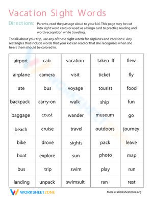 When sharing stories about vacations with friendswhich words do you use? Introduce your child to this compilation of sight wordsand once she has mastered them allshe will be prepared to recount captivating travel tales.