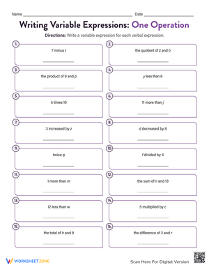 Learn to write algebraic expressions with variables! Translate verbal expressions into equations using this helpful worksheet. Start now!
