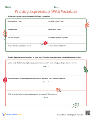 Practice expressions with variables using this helpful worksheet! Perfect for algebra students. Enhance problem-solving skills and math fluency. Get started now!
