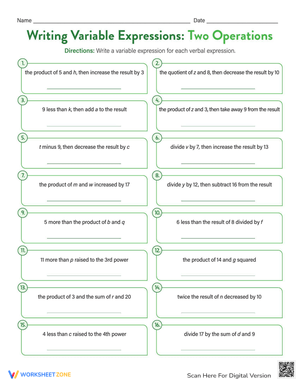 Practice writing variable expressions with two operations using this algebraic worksheet. Download now to improve math skills and understanding now!