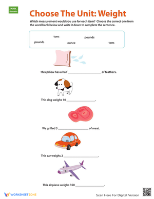 Choose the correct unit of weight for different objects! Enhance measurement skills with this practical math worksheet. Explore and improve measurement!
