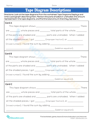 Students will be prompted to describe tape diagrams that represent fractional parts. By using specific and detailed language, they can effectively communicate their observations and understanding. This activity complements the Tape Diagram Displays worksheet, allowing students to further develop their skills in working with tape diagrams and expressing their ideas using descriptive terms.