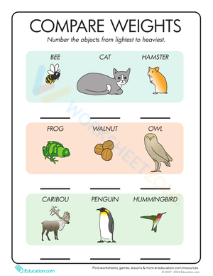 Compare weights of objects with this worksheet! Learn to estimate and differentiate weights in a practical way. Start comparing weights now!