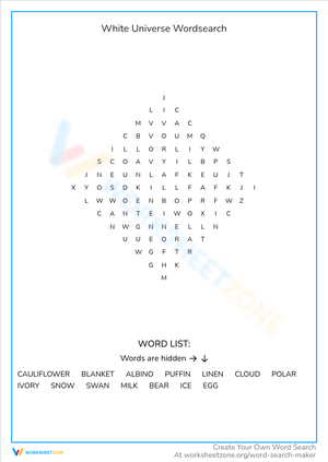Find 'white' words like MILK, ICE, & UNICORN in this grades 2-4 word search puzzle! Boost vocabulary & spelling skills. Download now!
