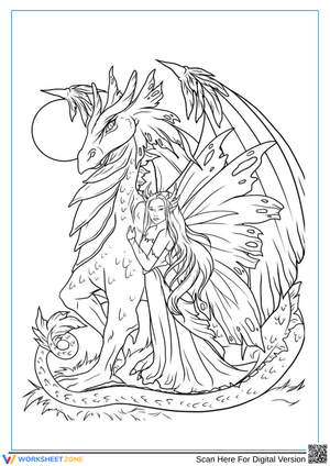 Mythical dragon and fairy coloring page for adults - perfect for fantasy lovers seeking a creative and relaxing coloring experience.