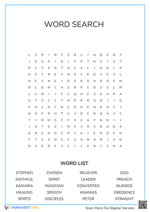 STEPHEN, CHOSEN, BELIEVER, GOD, FAITHFUL, SPIRIT, LEADER, PREACH, SAMARIA, MAGICIAN, CONVERTED, BLINDED, HEALING, SPEECH, ANANIAS, OBEDIENCE, SPIRTS, DISCIPLES, PETER, STRAIGHT