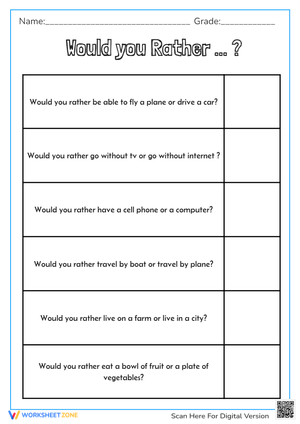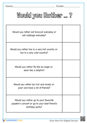Get kids thinking with this 'Would You Rather' worksheet! Spark fun discussions & critical thinking. Perfect for grades 2-6. Download now!
