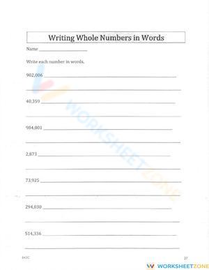 Practice writing whole numbers in words! Enhance number literacy and spelling skills with this writing numbers worksheet.