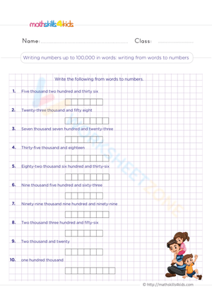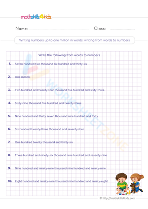 Practice writing numbers up to one million in words with this free printable math worksheet.
