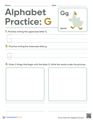 Practice tracing and writing letter G, with this alphabet practice worksheet, and improve handwriting skills. Download this early-learning tool today!