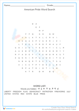 Show your American Pride with this themed word search! Reinforce vocabulary and learn about patriotic symbols. Perfect for all ages!