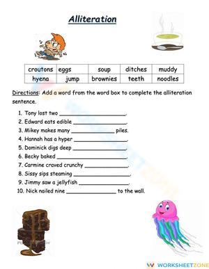 Which one is alliteration: Look! Larry lost Lucy, but luckily he located her.. The ....... ....... are in the middle aisle next to the vegetables: frozen fish. A ....... ....... ....... took the friends to the party: lovely, long, limousine. Peter piper picked a peck of ....... ......: pickled, pepper. "What a ....... ....... " is a famous song: Wonderful World. Are you hungry? Let's find a café for ....... ....... and ......: cakes, coffee, cola. She likes to read and she likes beadsTo her mother she only pleadsTo let her lead the house deedsEven the need to plant seeds.Is it an alliteration: No. Climb the chair to reach the ceiling.Is it an alliteration: No