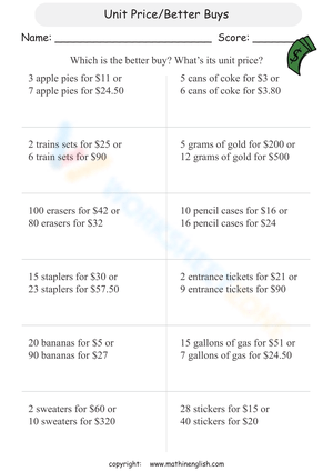 Learn how to use unit rates to find better buys! This worksheet teaches smart shopping and saving money. Start calculating unit costs now!