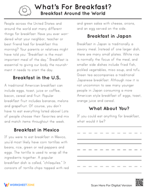 Encourage your child to broaden their cultural horizons and understand the importance of breakfast with this delightful reading comprehension worksheet. Embark on a scrumptious and educational journey by exploring the diverse breakfast foods consumed in different countries.