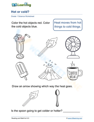 Heat transfers from hot things to cold things. In this worksheet, students identify hot and cold objects and the direction that heat moves.