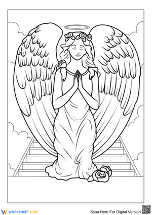 Angel coloring page with wings, halo, and folded hands. A peaceful and creative activity for kids, great for holiday, Sunday school, or calming art time.