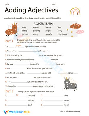 Enhance your adjective skills by adding them to sentences and words! This interactive worksheet offers an open-ended opportunity to exercise creativity and vocabulary. With the help of a word bank of adjectives, children will complete nine sentences, and then generate their own descriptive adjectives for five given nouns. Get ready to unleash your imagination.