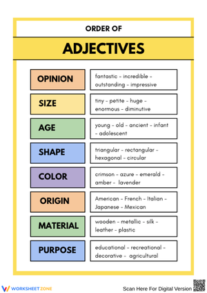 Learn the proper order of adjectives with this chart. It helps students structure their descriptions with clarity and precision by following the correct sequence.