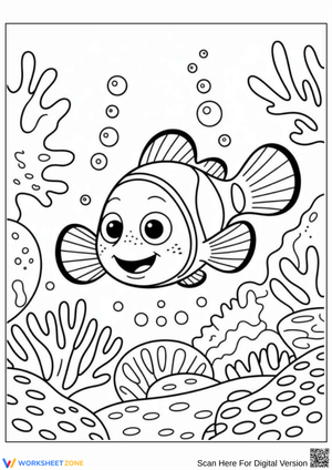Print and color this free Nemo coloring page with a smiling clownfish in coral reefs. Great for Pre-K and kindergarten ocean-themed fun and early learning activities.