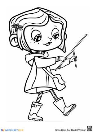 Cute Coraline coloring page in cartoon style with her rain boots and bag. Perfect for kids’ crafts, early coloring fun, and Coraline fans of all ages.