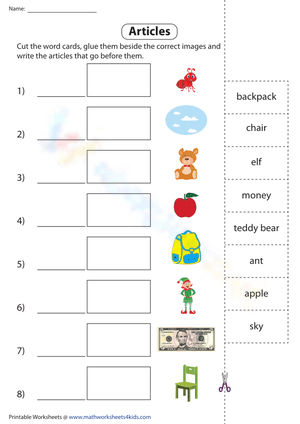 Practice using articles with this fun cut and glue activity worksheet! Perfect for learning 'a,' 'an,' and 'the.' Master Articles in a fun way!