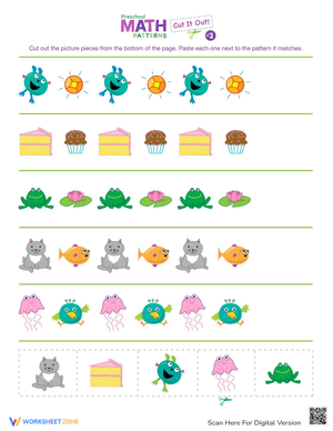 Learn Patterns with cut and paste! Enhance pattern recognition skills. Improve fine motor abilities and logical thinking. Get started with this Patterns worksheet!