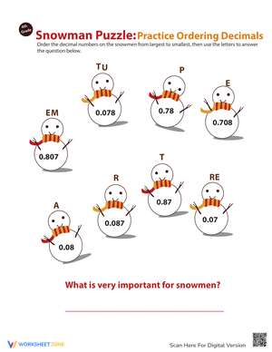 Practice ordering decimals with this snowman puzzle worksheet. A fun winter activity for Grade 4–5 students to build decimal place value skills.