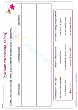 Enjoy this printable exercise of sorting the symbiotic pair under their relevant category to know of many more examples of interdependencies of organisms that is the major driving force of evolution.