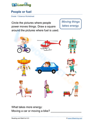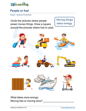 Moving things takes energy. In this worksheet, students identify whether objects are moved by people power or a fuel.