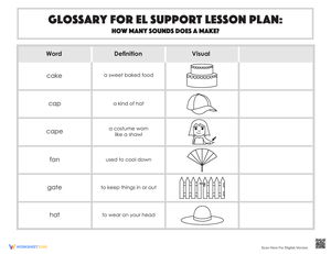 Help English learners master the sounds of A with this glossary worksheet. Students review words, definitions, and visuals to build vocabulary and phonics skills.