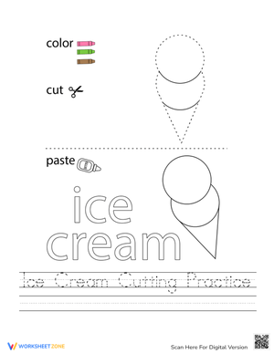 A fun and delicious way for kids to practice cutting skills! Color, cut, and paste the ice cream. Free printable worksheet for preschool and kindergarten.