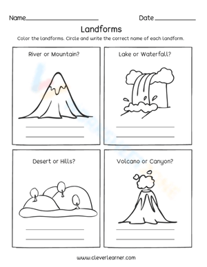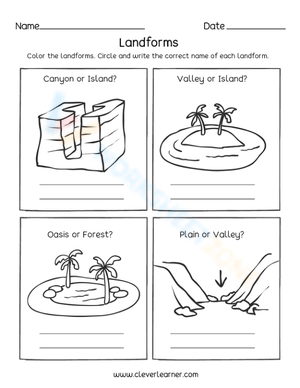 Help kids learn about landforms and bodies of water with this printable worksheet. Features canyons, volcanoes, plains, islands, and waterfalls.